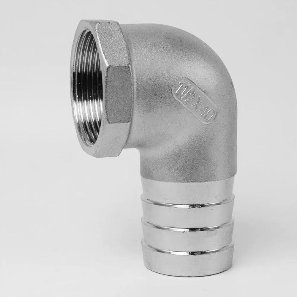 90 grade vroulike draad elmboog pas:Beskik oor 'n vroulike skroefdraad aan die een kant en 'n doringdraadslangpasstuk aan die ander kant, ontwerp vir verbinding met manlike skroefdraadkomponente.